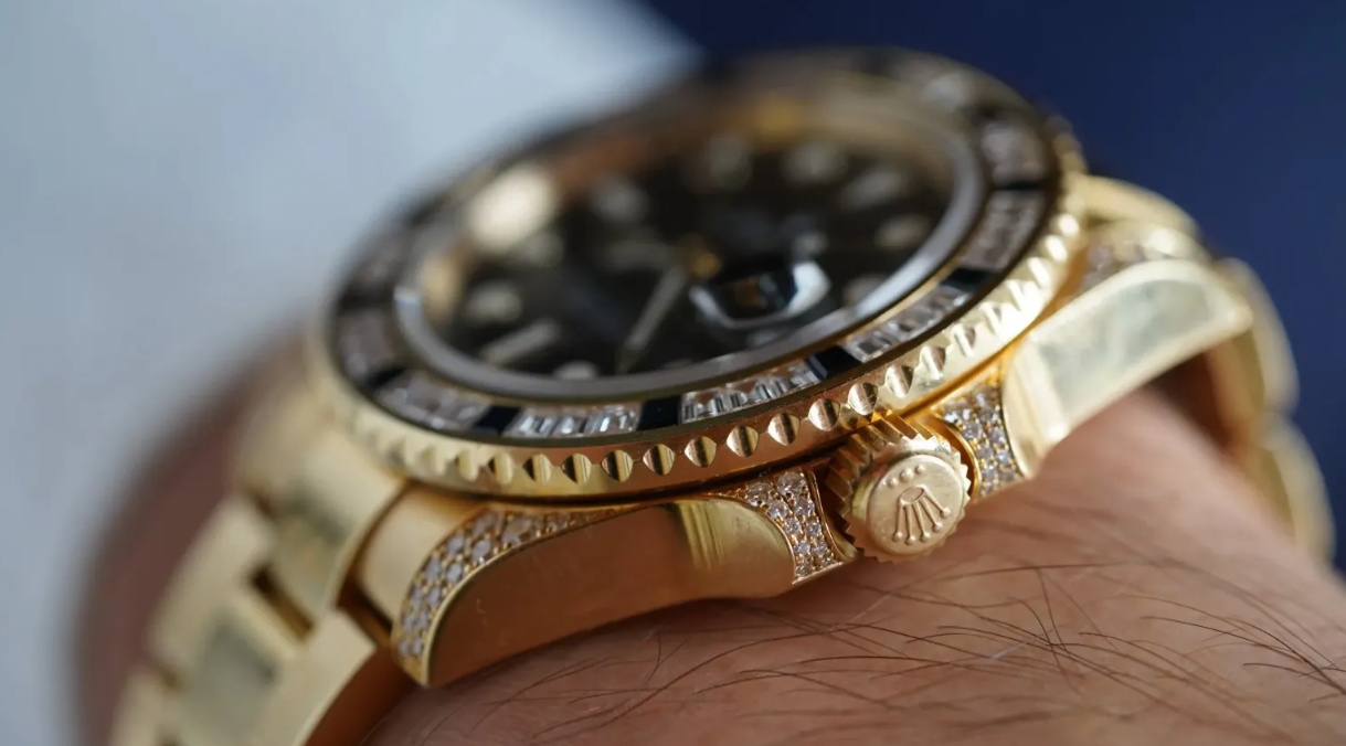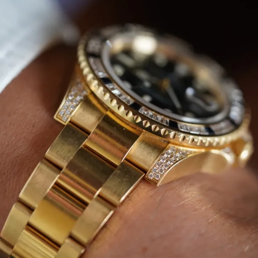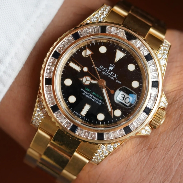 The replica watches UK in question is a Rolex GMT-Master II reference 116758SANR — a yellow gold, bedazzled, off-catalog version of the famed travel watch introduced circa 2006.